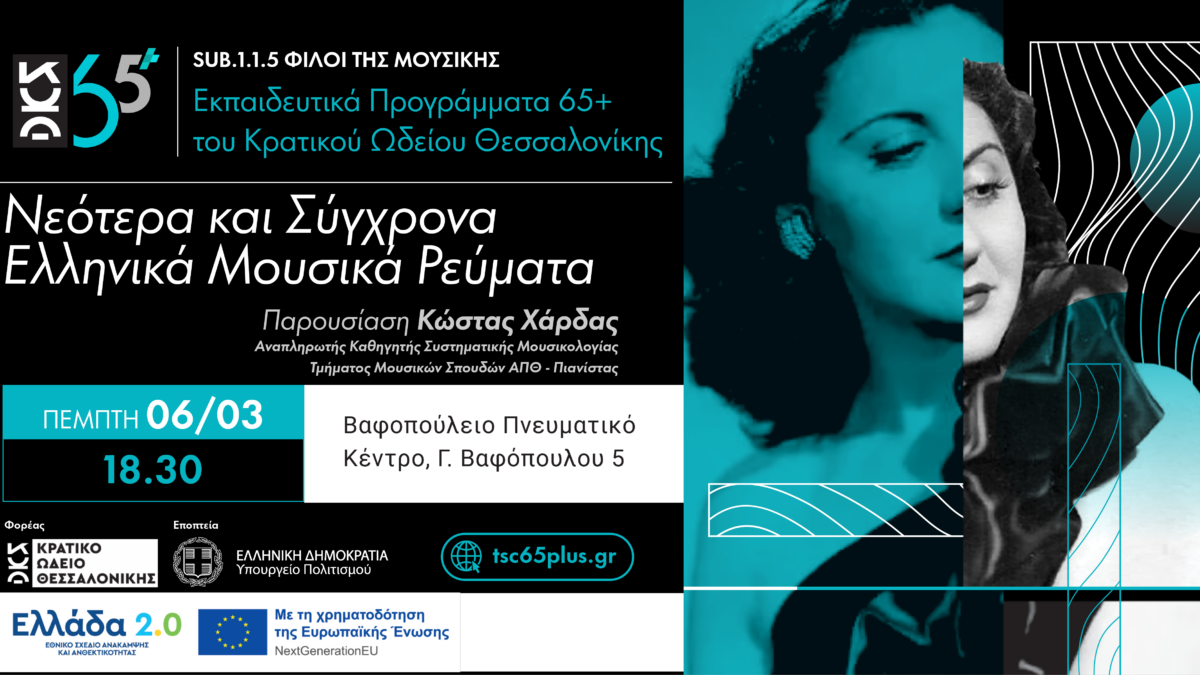 10/03/2025Παρουσίαση των Νεότερων και Σύγχρονων Ελληνικών μουσικών ρευμάτων και των παραγόντων που καθόρισαν τη διαμόρφωση και την εξέλιξή τους, στο πλαίσιο των εκπαιδευτικών προγραμμάτων 65+ του Κρατικού Ωδείου Θεσσαλονίκης.