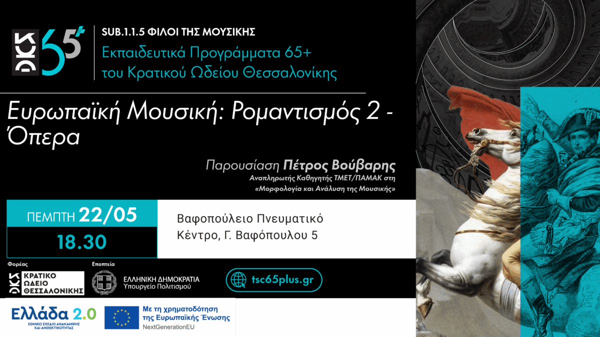 03/06/2025Παρουσίαση της Ευρωπαϊκής Μουσικής του Ρομαντισμού (Όπερα) και των παραγόντων που καθόρισαν τη διαμόρφωση και την εξέλιξή της, στο πλαίσιο των εκπαιδευτικών προγραμμάτων 65+ του Κρατικού Ωδείου Θεσσαλονίκης