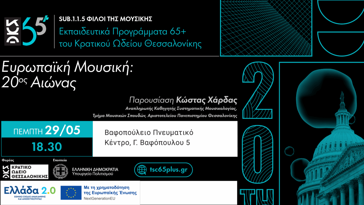 03/06/2025Παρουσίαση της Σύγχρονης Ευρωπαϊκής Μουσικής του 20ου αιώνα και των παραγόντων που καθόρισαν τη διαμόρφωση και την εξέλιξή της, στο πλαίσιο των εκπαιδευτικών προγραμμάτων 65+ του Κρατικού Ωδείου Θεσσαλονίκης.