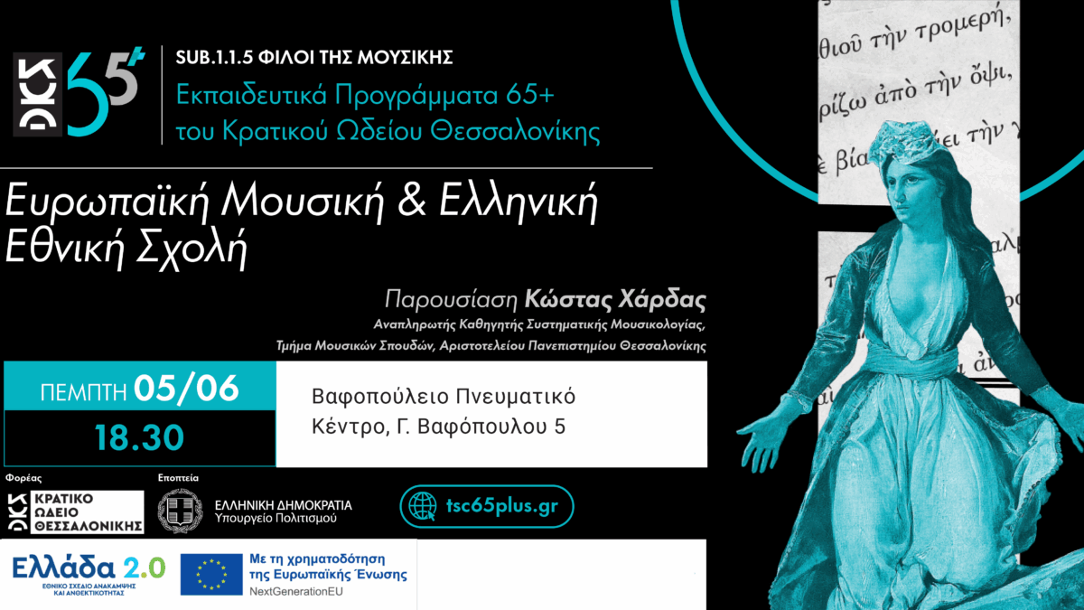 24/09/2025Παρουσίαση της Εθνικής Σχολής Μουσικής και των παραγόντων που καθόρισαν τη διαμόρφωση και την εξέλιξή της, στο πλαίσιο των εκπαιδευτικών προγραμμάτων 65+ του Κρατικού Ωδείου Θεσσαλονίκης