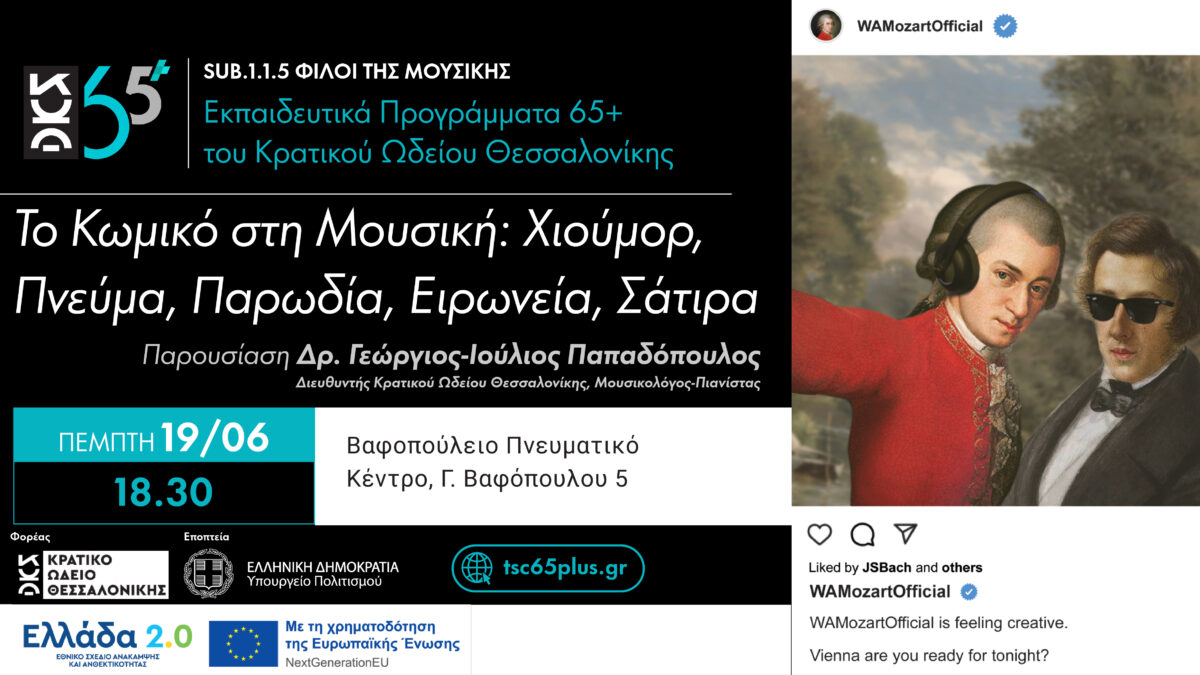 Σε μία δίωρη πολυμεσική παρουσίαση με πολλά οπτικοακουστικά παραδείγματα, θα ταξιδέψουμε στις θεωρίες και τις κατηγορίες του κωμικού και στους τρόπους με τους οποίους εκδηλώνονται στη μουσική, από την Αναγέννηση έως τον 20ο αιώνα.Μελετώντας τις απόψεις φιλοσόφων, κριτικών και μουσικών, θα περάσουμε από τη θεωρία στην πράξη αναλύοντας κωμικά μουσικά στιγμιότυπα.